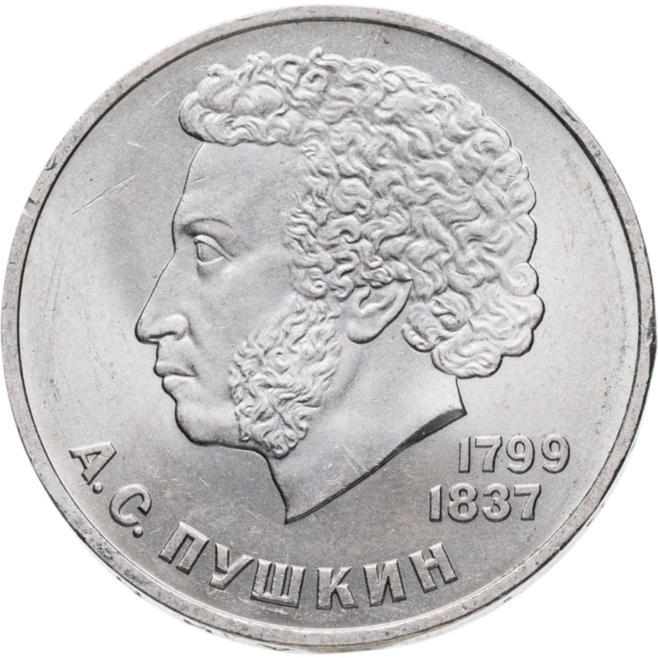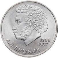 Первой монетой СССР, посвящённой великим поэтам и писателям, был юбилейный рубль, посвящённый «нашему всему» А.С. Пушкину. Монету выпустили к 185-ой годовщине со дня рождения великого русского поэта.