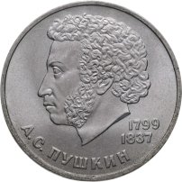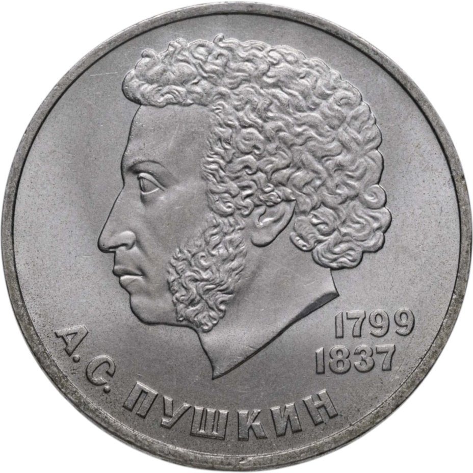 Первой монетой СССР, посвящённой великим поэтам и писателям, был юбилейный рубль, посвящённый «нашему всему» А.С. Пушкину. Монету выпустили к 185-ой годовщине со дня рождения великого русского поэта.