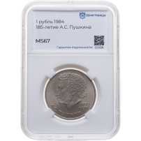 1 рубль 1984 "185-летие со дня рождения А.С. Пушкина", в слабе Монетник.ру MS67
