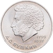 Первой монетой СССР, посвящённой великим поэтам и писателям, был юбилейный рубль, посвящённый «нашему всему» А.С. Пушкину. Монету выпустили к 185-ой годовщине со дня рождения великого русского поэта.