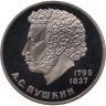 Первой монетой СССР, посвящённой великим поэтам и писателям, был юбилейный рубль, посвящённый «нашему всему» А.С. Пушкину. Монету выпустили к 185-ой годовщине со дня рождения великого русского поэта.