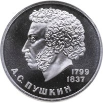 Первой монетой СССР, посвящённой великим поэтам и писателям, был юбилейный рубль, посвящённый «нашему всему» А.С. Пушкину. Монету выпустили к 185-ой годовщине со дня рождения великого русского поэта.