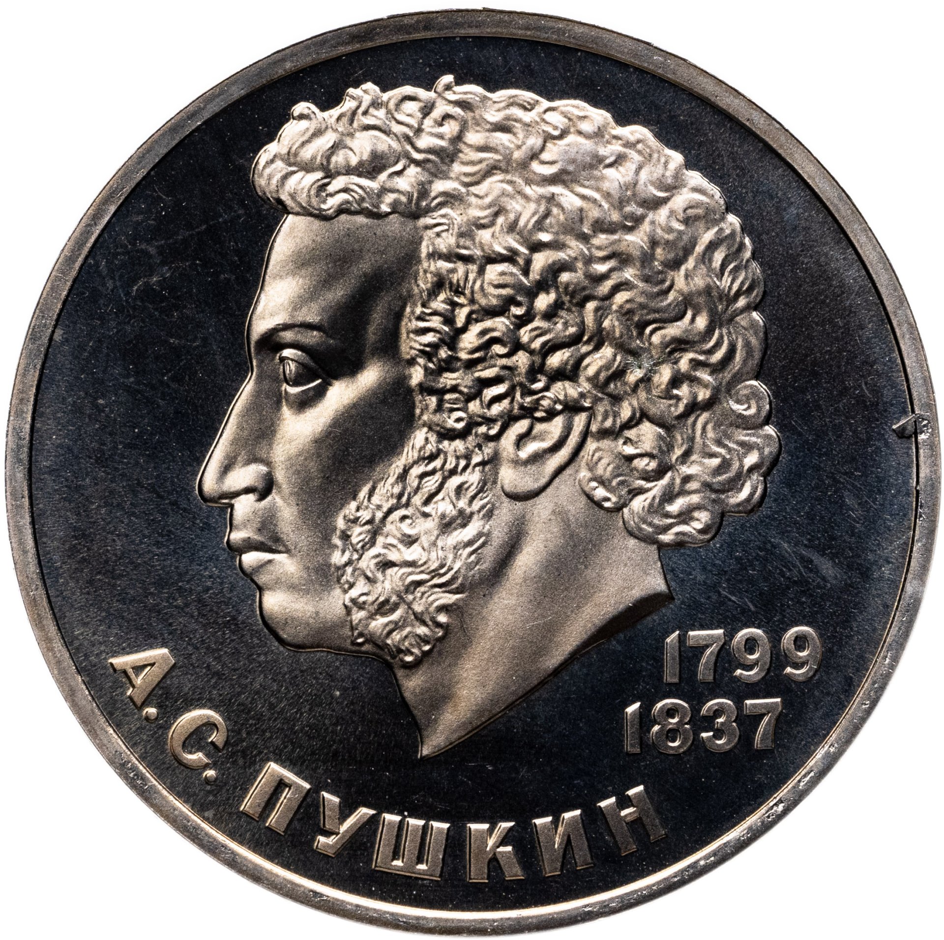 В центре изображение А. С. Пушкина и справа от него в две строки даты «1799» и «1837», в нижней части полукругом надпись «А. С. ПУШКИН».
