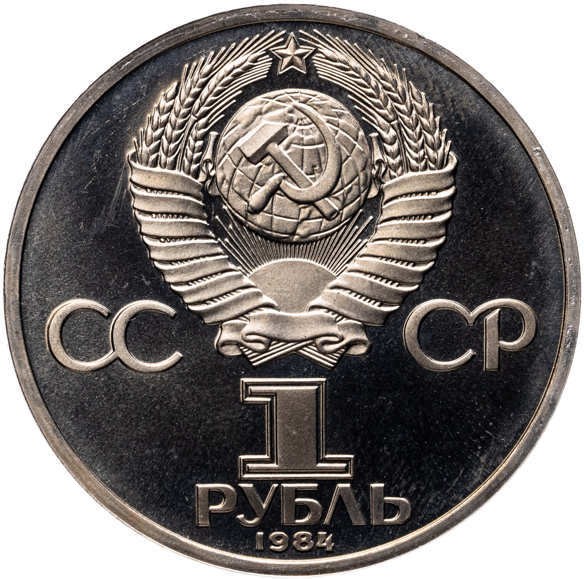 Сверху герб СССР с 15 витками ленты, слева от него буквы «СС», справа «СР», ниже обозначение достоинства монеты цифра «1» и ниже слово «РУБЛЬ», внизу у канта год выпуска монеты «1984».