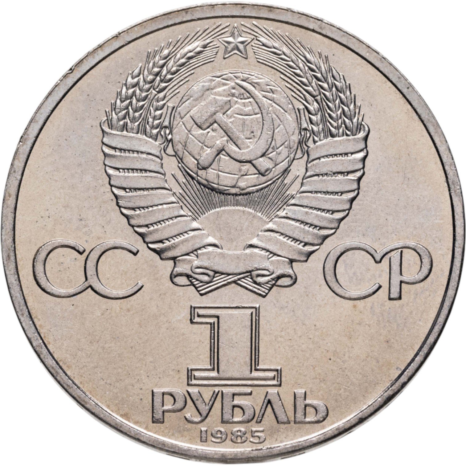 Сверху герб СССР с 15 витками ленты, слева от него буквы «СС», справа «СР», ниже обозначение достоинства монеты цифра «1» и ниже слово «РУБЛЬ», внизу у канта год выпуска монеты «1985».