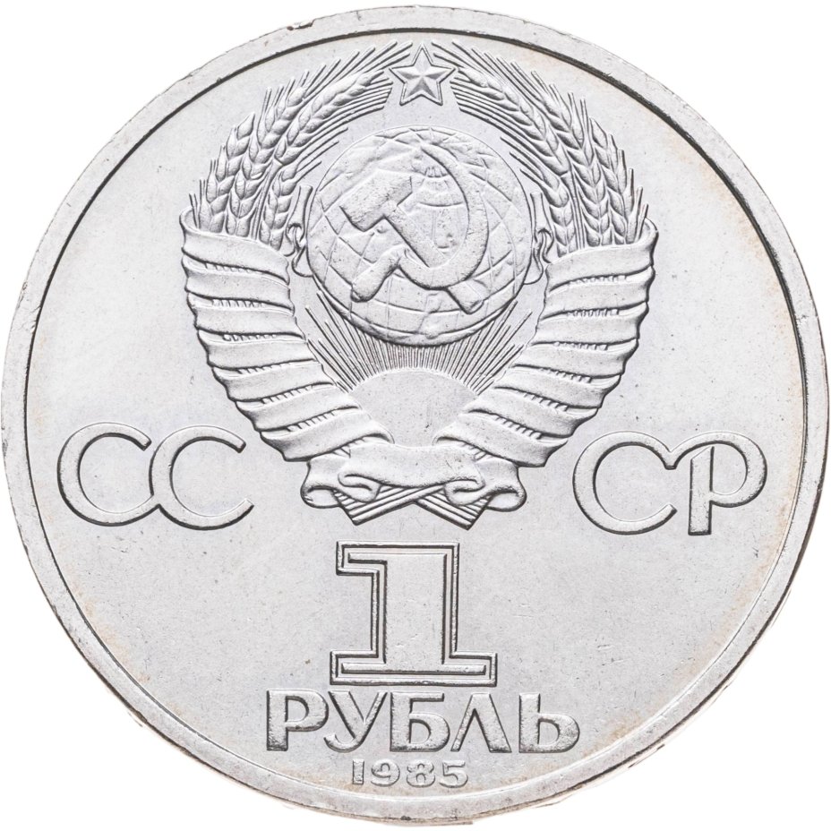 На аверсе в верхней части изображён Государственный герб СССР. Его классическое изображение — серп и молот, за ними земной шар с восходящим солнцем, наверху пятиконечная звезда, по бокам снопы пшеницы, перевязанные пятнадцатью лентами по количеству республик, входящих в состав СССР. Ниже герба — номинал-цифра 1, еще ниже-слово "рубль", указан год чеканки - 1985. По обеим сторонам герба располагается надпись "СССР", поделенная пополам.