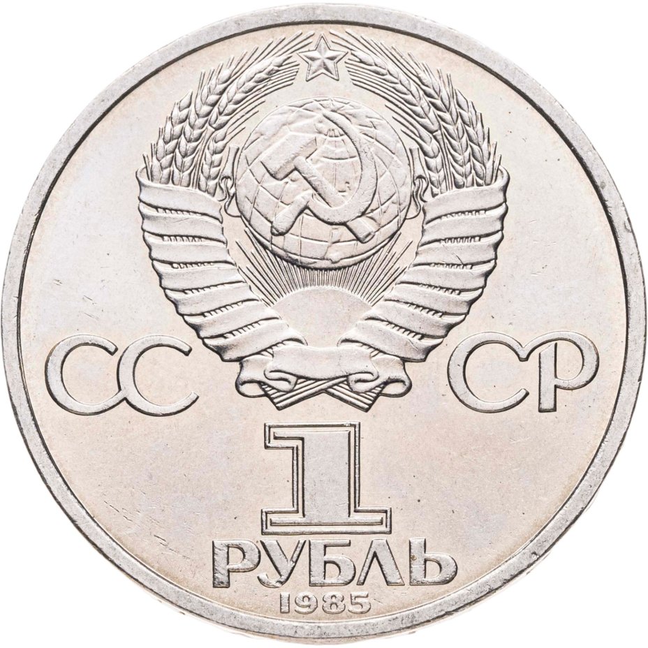 На аверсе в верхней части изображён Государственный герб СССР. Его классическое изображение — серп и молот, за ними земной шар с восходящим солнцем, наверху пятиконечная звезда, по бокам снопы пшеницы, перевязанные пятнадцатью лентами по количеству республик, входящих в состав СССР. Ниже герба — номинал-цифра 1, еще ниже-слово "рубль", указан год чеканки - 1985. По обеим сторонам герба располагается надпись "СССР", поделенная пополам.