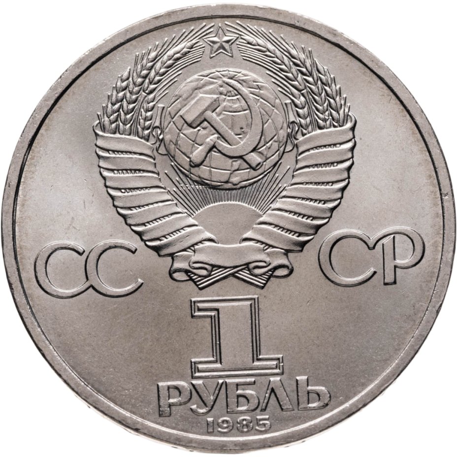 Сверху герб СССР с 15 витками ленты, слева от него буквы «СС», справа «СР», ниже обозначение достоинства монеты цифра «1» и ниже слово «РУБЛЬ», внизу у канта год выпуска монеты «1985».