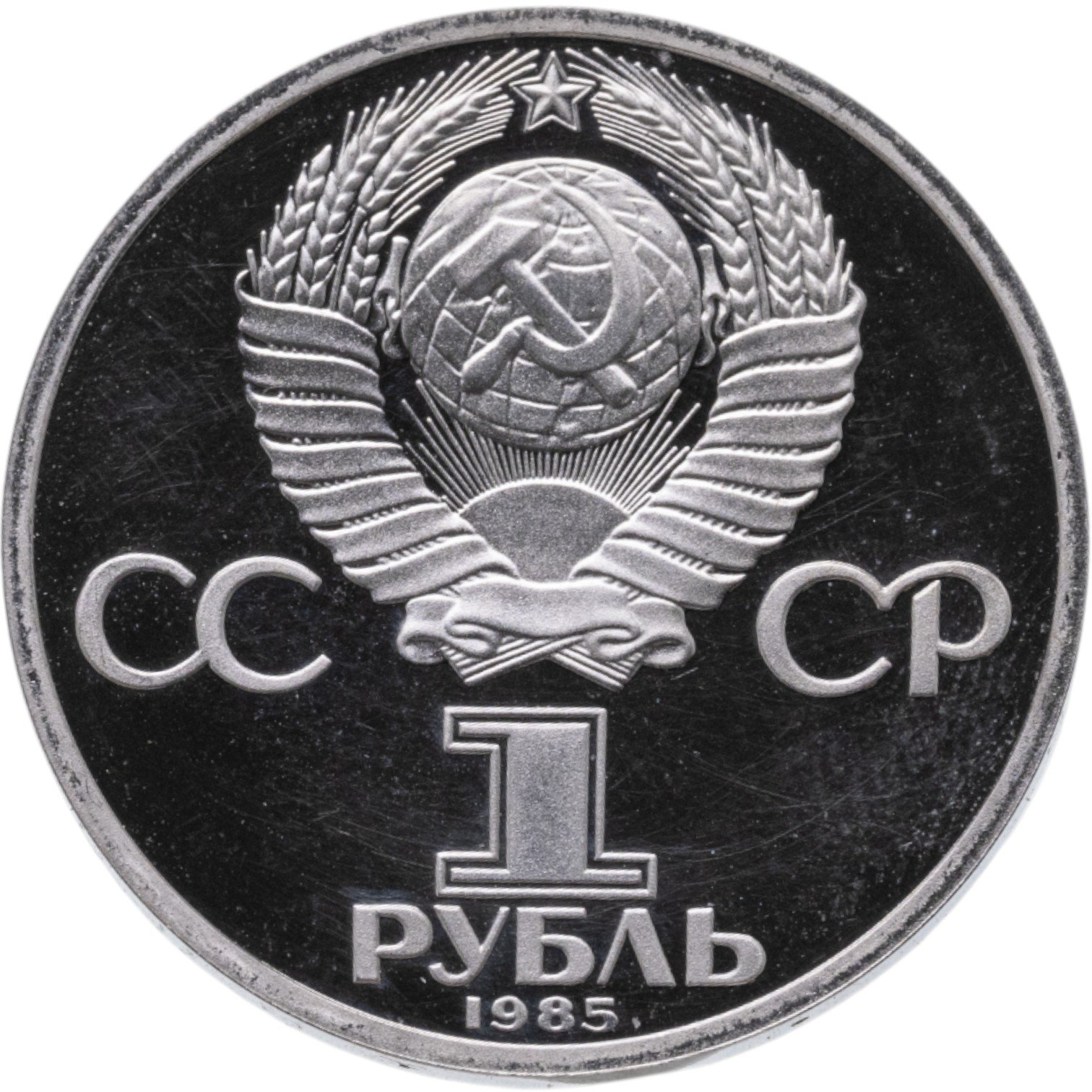 На аверсе в верхней части изображён Государственный герб СССР. Его классическое изображение — серп и молот, за ними земной шар с восходящим солнцем, наверху пятиконечная звезда, по бокам снопы пшеницы, перевязанные пятнадцатью лентами по количеству республик, входящих в состав СССР. Ниже герба — номинал-цифра 1, еще ниже-слово "рубль", указан год чеканки - 1985. По обеим сторонам герба располагается надпись "СССР", поделенная пополам.
