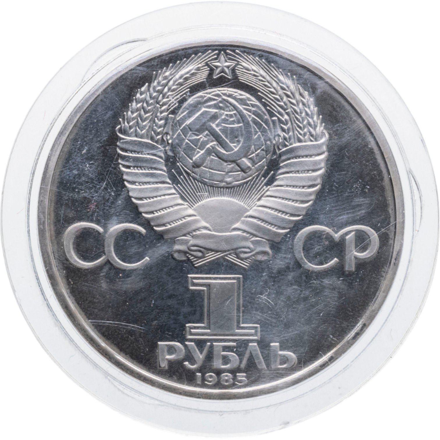 Сверху герб СССР с 15 витками ленты, слева от него буквы «СС», справа «СР», ниже обозначение достоинства монеты цифра «1» и ниже слово «РУБЛЬ», внизу у канта год выпуска монеты «1985».