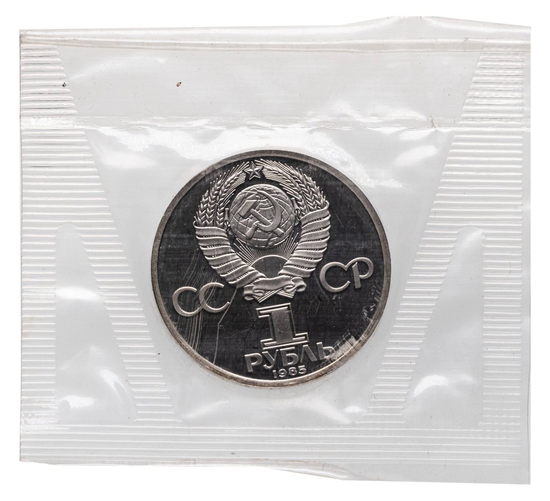 Гурт — надписи "один рубль» и «9 мая 1975», разделенные двумя пятиконечными звездами. Диаметр - 31 мм, толщина - 2,3 мм, вес - 12,8 гр., тираж - 1 960 000 штук, металл — мельхиор. Дата выпуска - 23.04.1985 г. Над дизайном работали скульптор И.С. Комшилов и художник В.А. Ермаков.