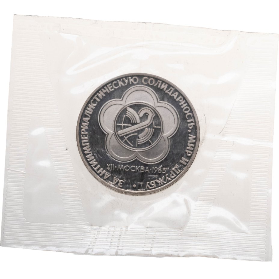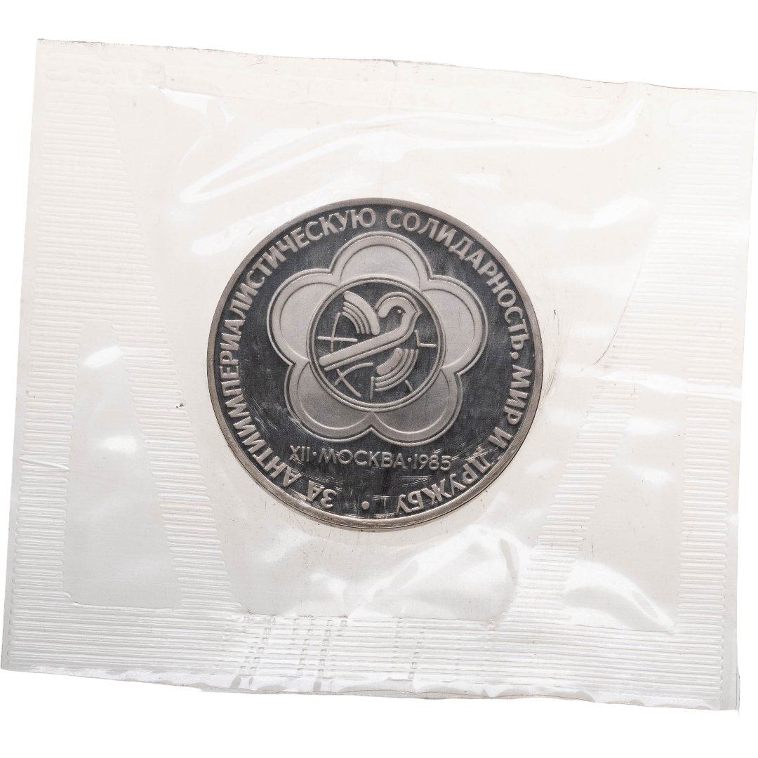 Весьма незаурядным событием в жизни Страны Советов стал проводимый в 1985 году с 27 июля по 3 августа в Москве XII Всемирный фестиваль молодежи и студентов. Важно отметить, что события фестиваля происходили в самый разгар так называемой "холодной войны", то есть противостояния двух мировых сверхдержав — СССР и США. В фестивале принимали участие более 26 тысяч человек, представлявшие 157 стран мира. При подготовке к фестивалю издавались плакаты, почтовые марки, проводился специальный тираж лотереи, и конечно же, свет увидела памятная монета, которая нас с Вами интересует. На монете также отражён и лозунг фестиваля — «За антиимпериалистическую солидарность, мир и дружбу».