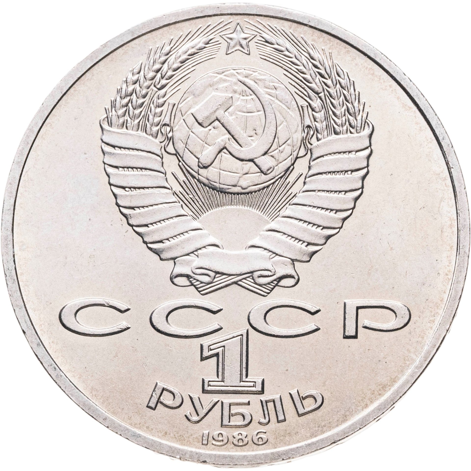 На аверсе - в центральной части отчеканен Государственный герб Советского Союза — серп и молот на фоне земного шара, по бокам снопы пшеницы, увитые пятнадцатью лентами (по количеству союзных республик), венчается изображение пятиконечной звездой. Под гербом — надпись СССР, ниже — номинал монеты цифра 1 и надпись "рубль", расположенное полукругом. Под номиналом год чеканки монеты -1986. На обеих сторонах монеты по окружности — выпуклый кант.