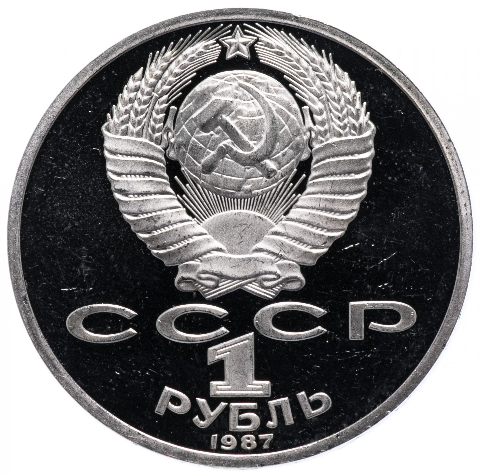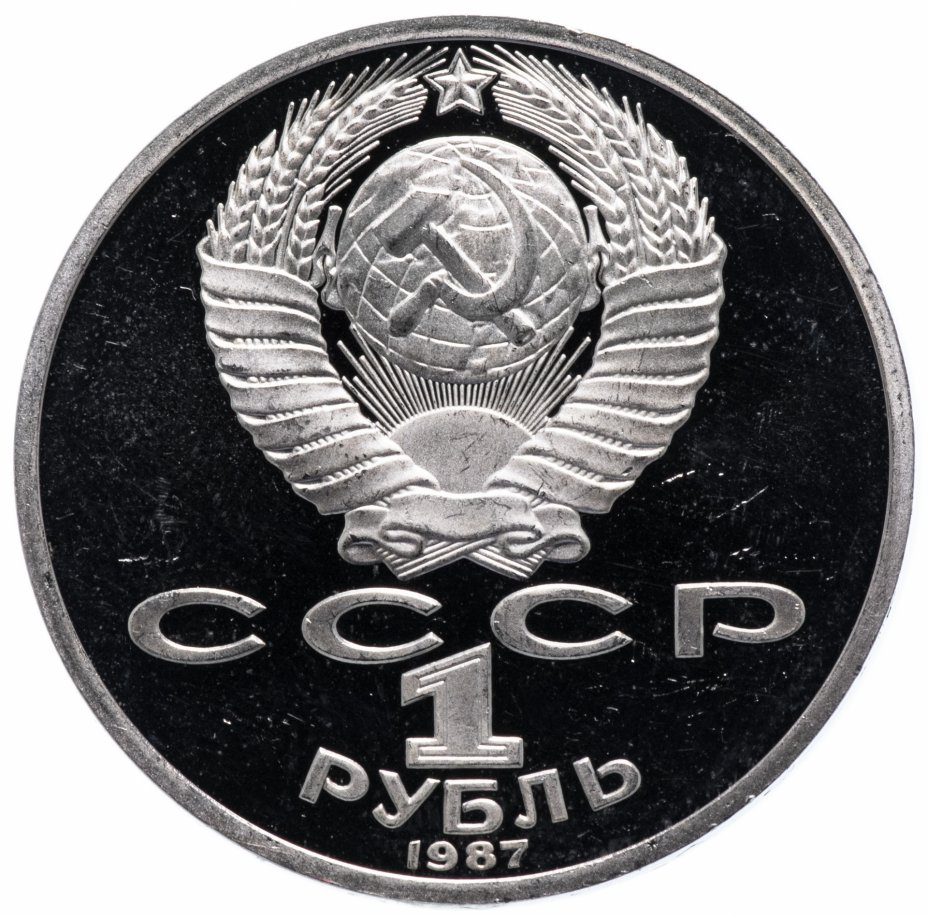 Сверху герб СССР с 15 витками ленты, под ним буквы «СССР», ниже обозначение достоинства монеты цифра «1» и ниже слово «РУБЛЬ», внизу у канта год выпуска монеты «1987».