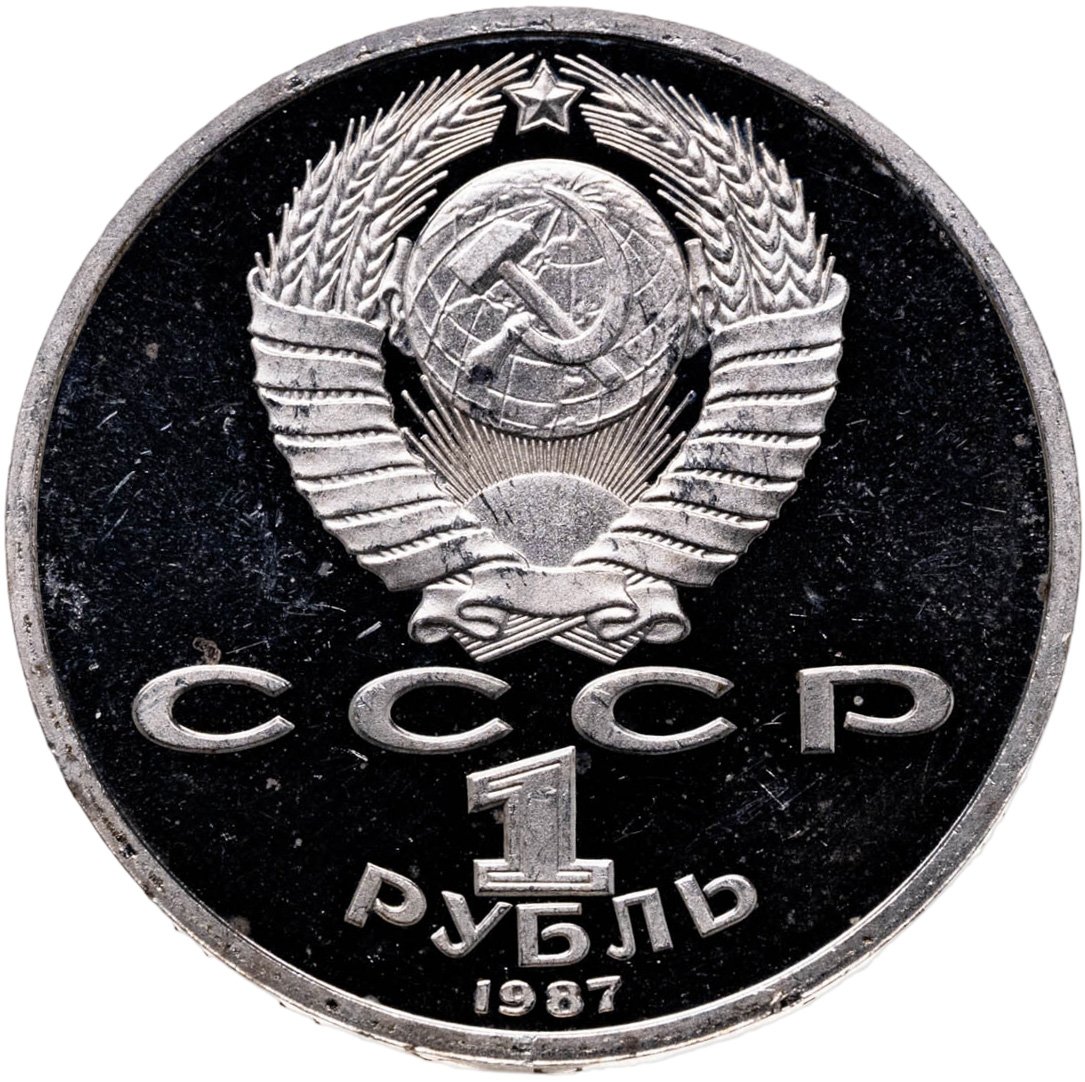 Сверху герб СССР с 15 витками ленты, под ним буквы «СССР», ниже обозначение достоинства монеты цифра «1» и ниже слово «РУБЛЬ», внизу у канта год выпуска монеты «1987».