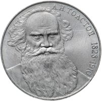 Ко дню рождения (или годовщине смерти) великих людей в СССР с 1970 по 1991 было принято чеканить памятные обиходные рублёвые монеты. В 1988 исполнялось 160 лет со дня рождения Льва Толстого, в честь чего и была выпущена памятная мельхиоровая монета тиражом 4 млн экземпляров. 225 тысяч из них – в качестве «пруф» (специально для коллекционеров), а остальные «анциркулейтед» (обычное). Всего есть 3 разновидности этих монет: обычная, с ошибкой даты чеканки (год 1987), и «Злой Толстой» – отчеканенные штемпелем «А» и «Д» монеты с большей рельефностью. Редкими считаются штемпель «Д» и монеты с неправильной датой.
