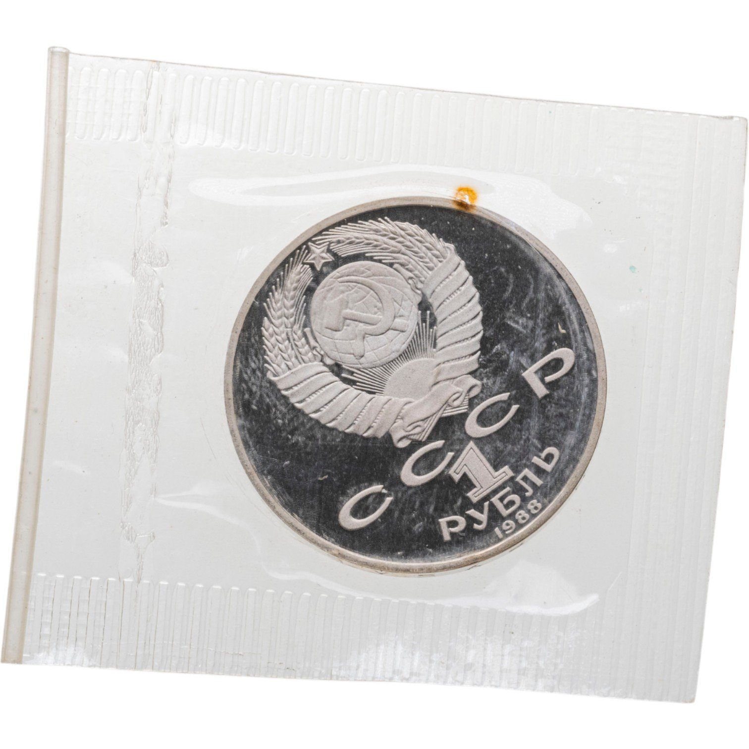 Сверху герб СССР с 15 витками ленты, под ним буквы «СССР», ниже обозначение достоинства монеты цифра «1» и ниже слово «РУБЛЬ», внизу у канта год выпуска монеты «1988».