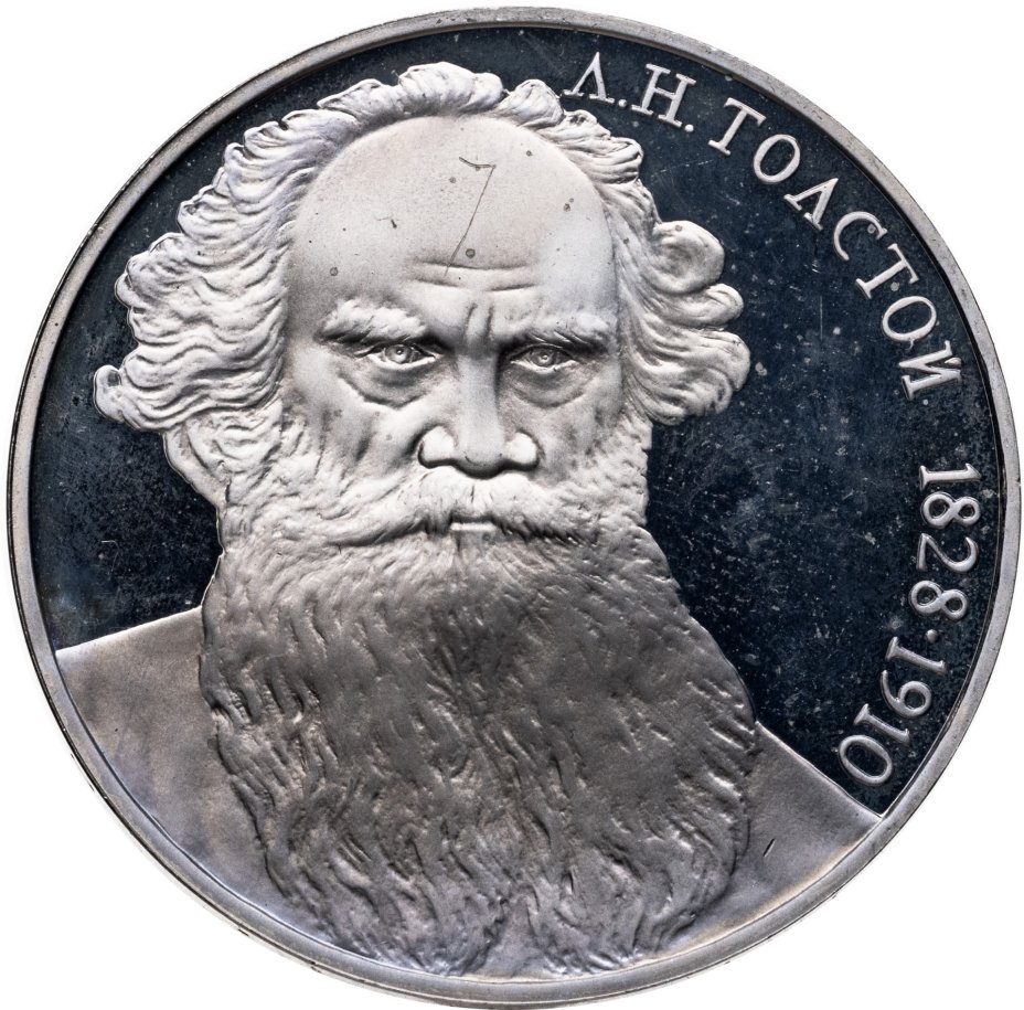 Ко дню рождения (или годовщине смерти) великих людей в СССР с 1970 по 1991 было принято чеканить памятные обиходные рублёвые монеты. В 1988 исполнялось 160 лет со дня рождения Льва Толстого, в честь чего и была выпущена памятная мельхиоровая монета тиражом 4 млн экземпляров. 225 тысяч из них – в качестве «пруф» (специально для коллекционеров), а остальные «анциркулейтед» (обычное). Всего есть 3 разновидности этих монет: обычная, с ошибкой даты чеканки (год 1987), и «Злой Толстой» – отчеканенные штемпелем «А» и «Д» монеты с большей рельефностью. Редкими считаются штемпель «Д» и монеты с неправильной датой.