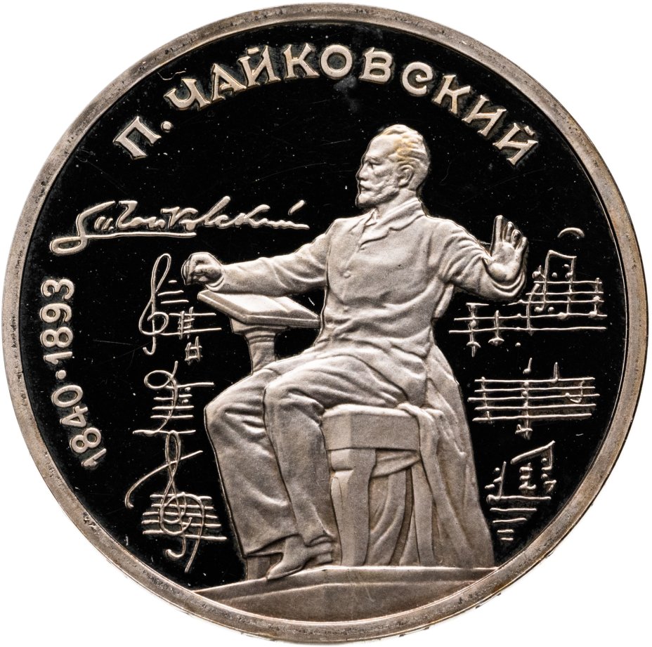 В центре на фоне нотного стана изображение П. И. Чайковского, сидящего на стуле. Слева полукругом даты «1840», «1893», разделенные точкой, обозначающие годы жизни поэта. Над датами - факсимиле писателя. Вверху по окружности надпись «П. Чайковский».