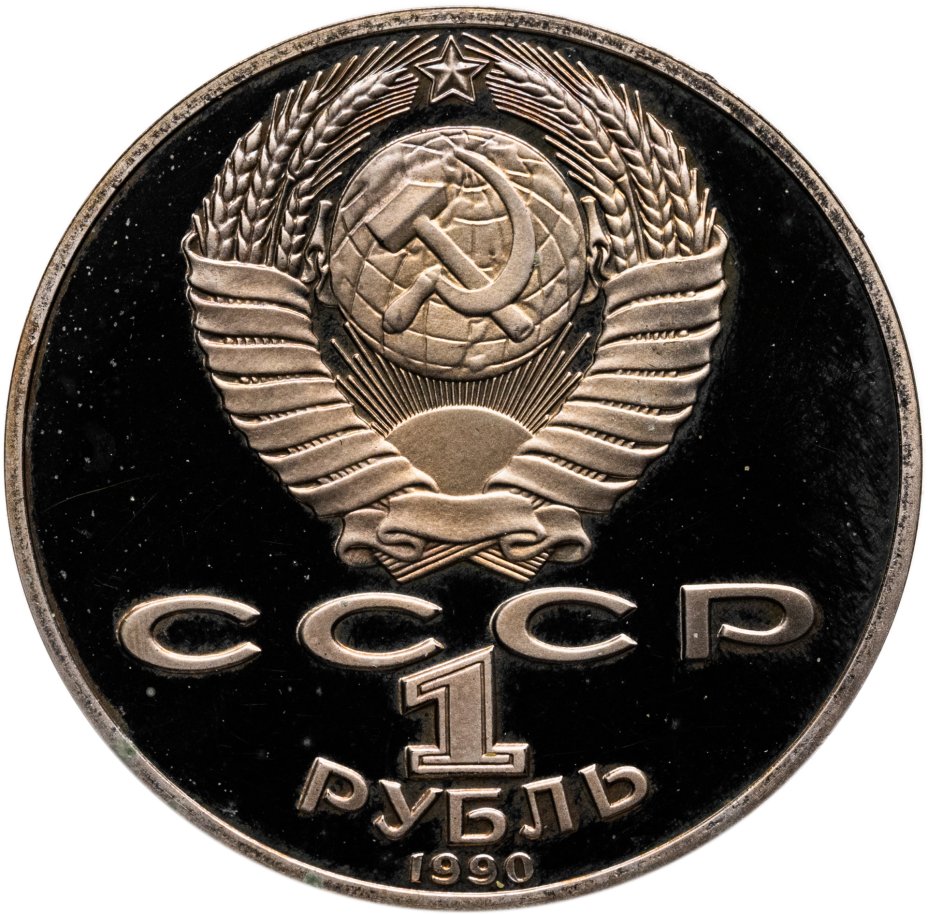 Сверху герб СССР с 15 витками ленты, под ним буквы «СССР», ниже обозначение достоинства монеты цифра «1» и ниже слово «РУБЛЬ», внизу у канта год выпуска монеты «1990».