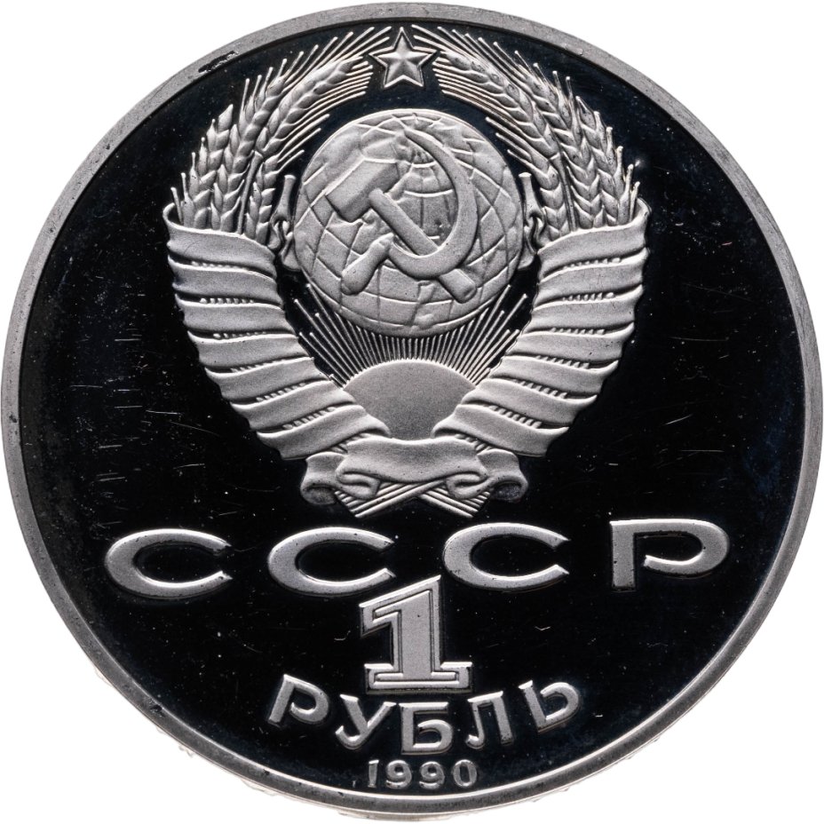 Сверху герб СССР с 15 витками ленты, под ним буквы «СССР», ниже обозначение достоинства монеты цифра «1» и ниже слово «РУБЛЬ», внизу у канта год выпуска монеты «1990».