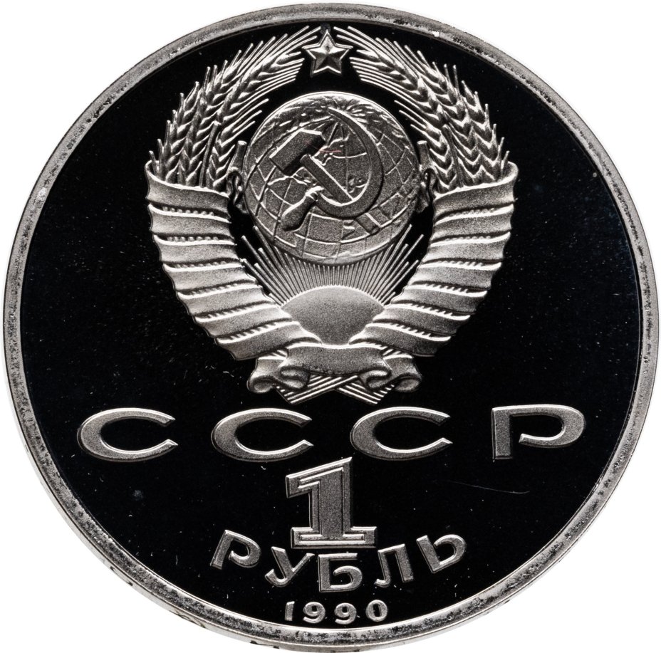 Сверху герб СССР с 15 витками ленты, под ним буквы «СССР», ниже обозначение достоинства монеты цифра «1» и ниже слово «РУБЛЬ», внизу у канта год выпуска монеты «1990».