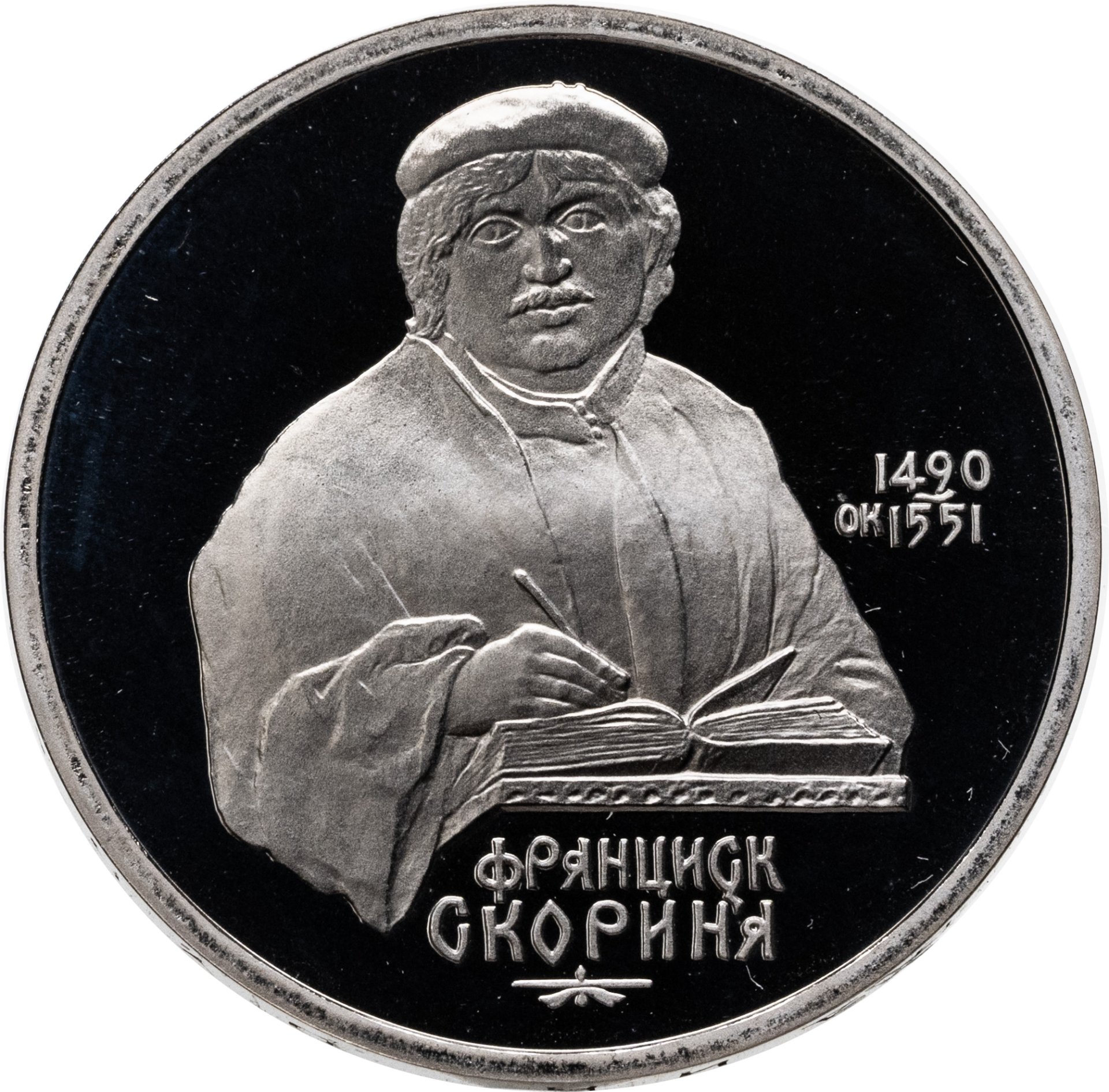 В центре изображение Ф. Скорины, перед ним раскрытая книга, в руке карандаш. Справа в две строки даты «1490», «ок.1541»,обозначающие годы жизни поэта. Внизу в две строки надпись «Франциск Скорина». Под надписью орнамент.