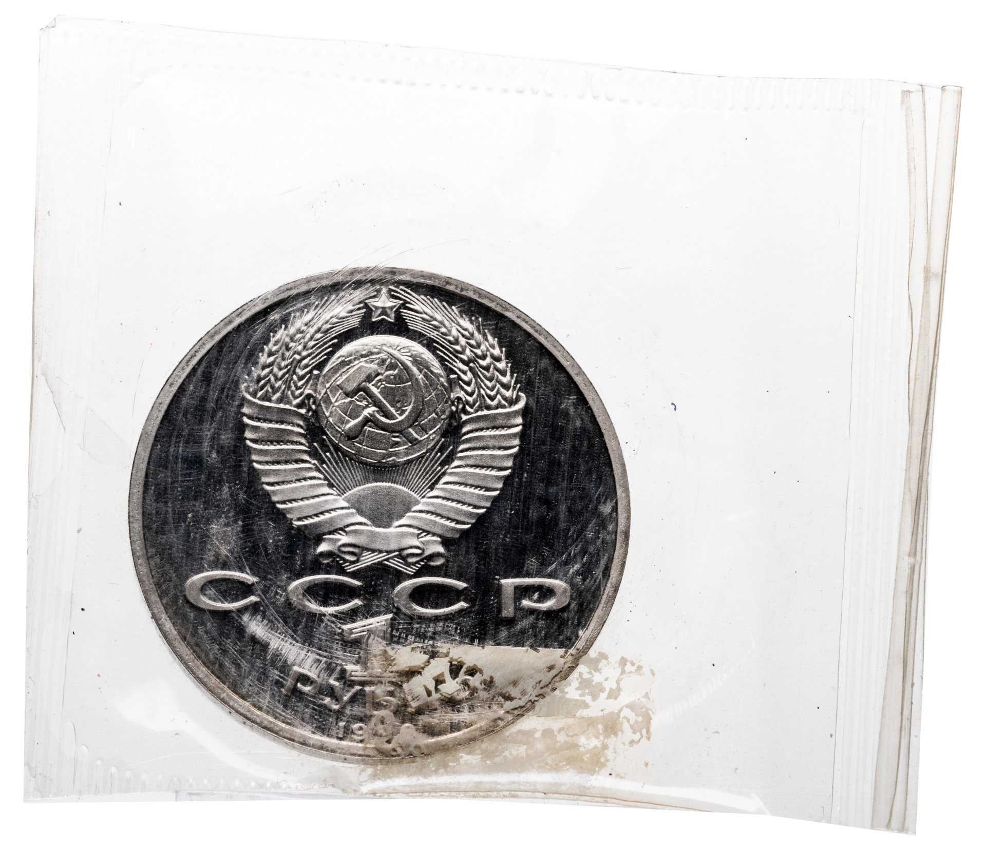 Сверху герб СССР с 15 витками ленты, под ним буквы «СССР», ниже обозначение достоинства монеты цифра «1» и ниже слово «РУБЛЬ», внизу у канта год выпуска монеты «1990».