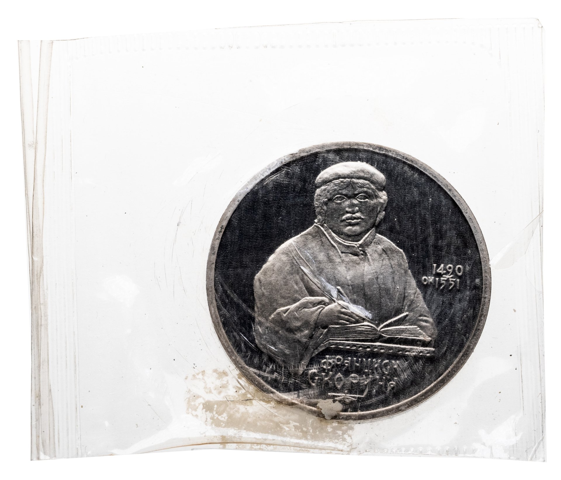 В центре изображение Ф. Скорины, перед ним раскрытая книга, в руке карандаш. Справа в две строки даты «1490», «ок.1541»,обозначающие годы жизни поэта. Внизу в две строки надпись «Франциск Скорина». Под надписью орнамент.