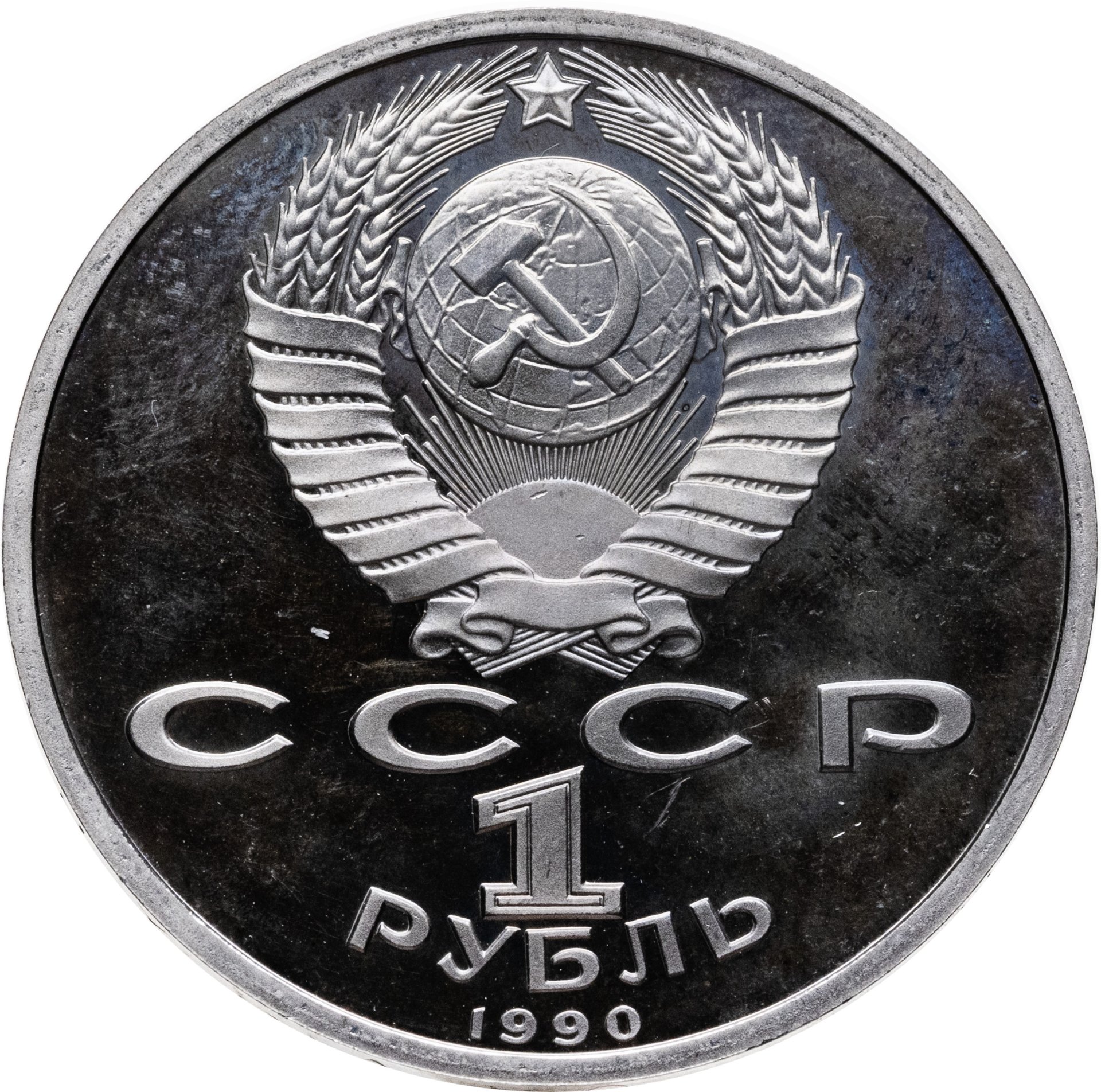 Сверху герб СССР с 15 витками ленты, под ним буквы «СССР», ниже обозначение достоинства монеты цифра «1» и ниже слово «РУБЛЬ», внизу у канта год выпуска монеты «1990».
