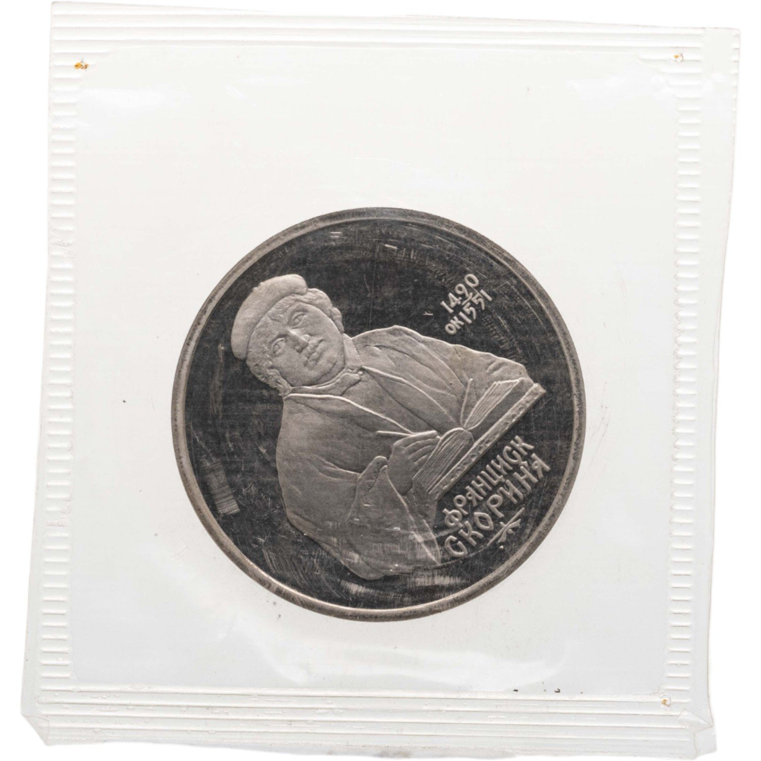 В центре изображение Ф. Скорины, перед ним раскрытая книга, в руке карандаш. Справа в две строки даты «1490», «ок.1541»,обозначающие годы жизни поэта. Внизу в две строки надпись «Франциск Скорина». Под надписью орнамент.