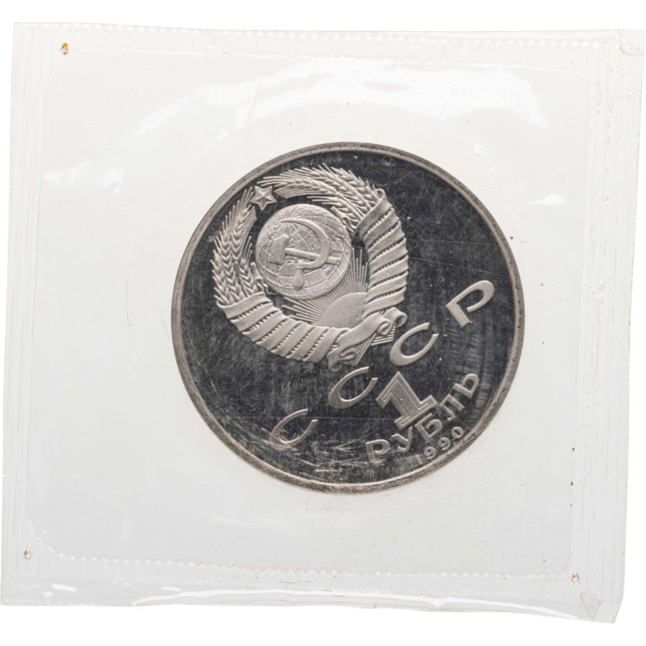 Сверху герб СССР с 15 витками ленты, под ним буквы «СССР», ниже обозначение достоинства монеты цифра «1» и ниже слово «РУБЛЬ», внизу у канта год выпуска монеты «1990».