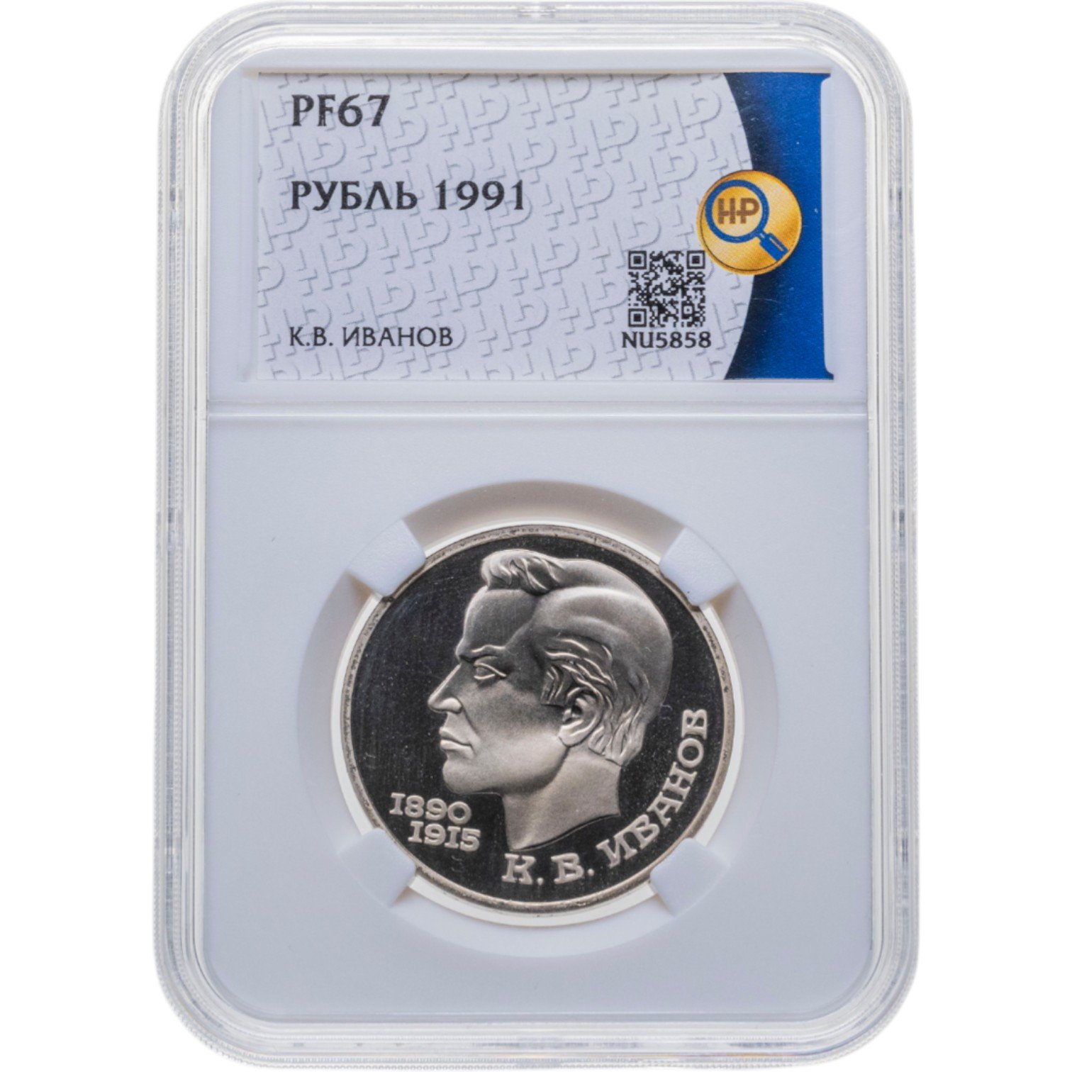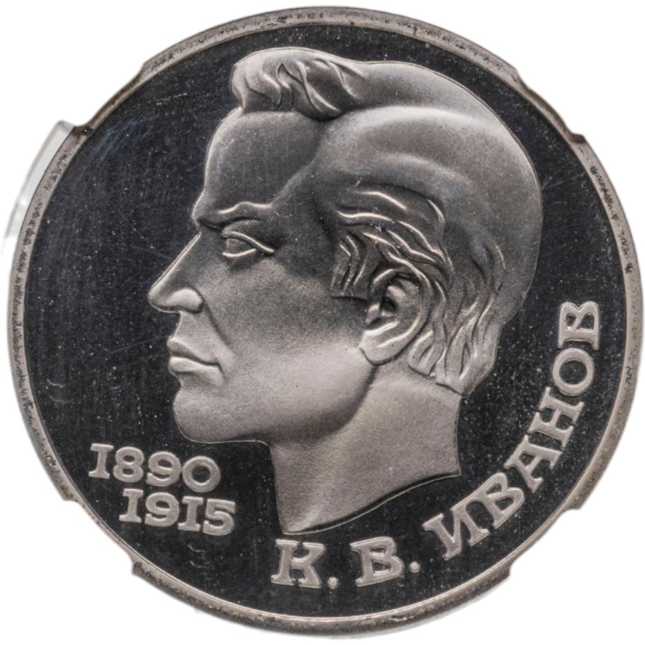 В центре профильный портрет К. В. Иванова. Слева от него под подбородком годы жизни поэта «1890» и «1915», написанные в две строки. Внизу справа вдоль внешнего ободка монеты надпись «К. В. ИВАНОВ».