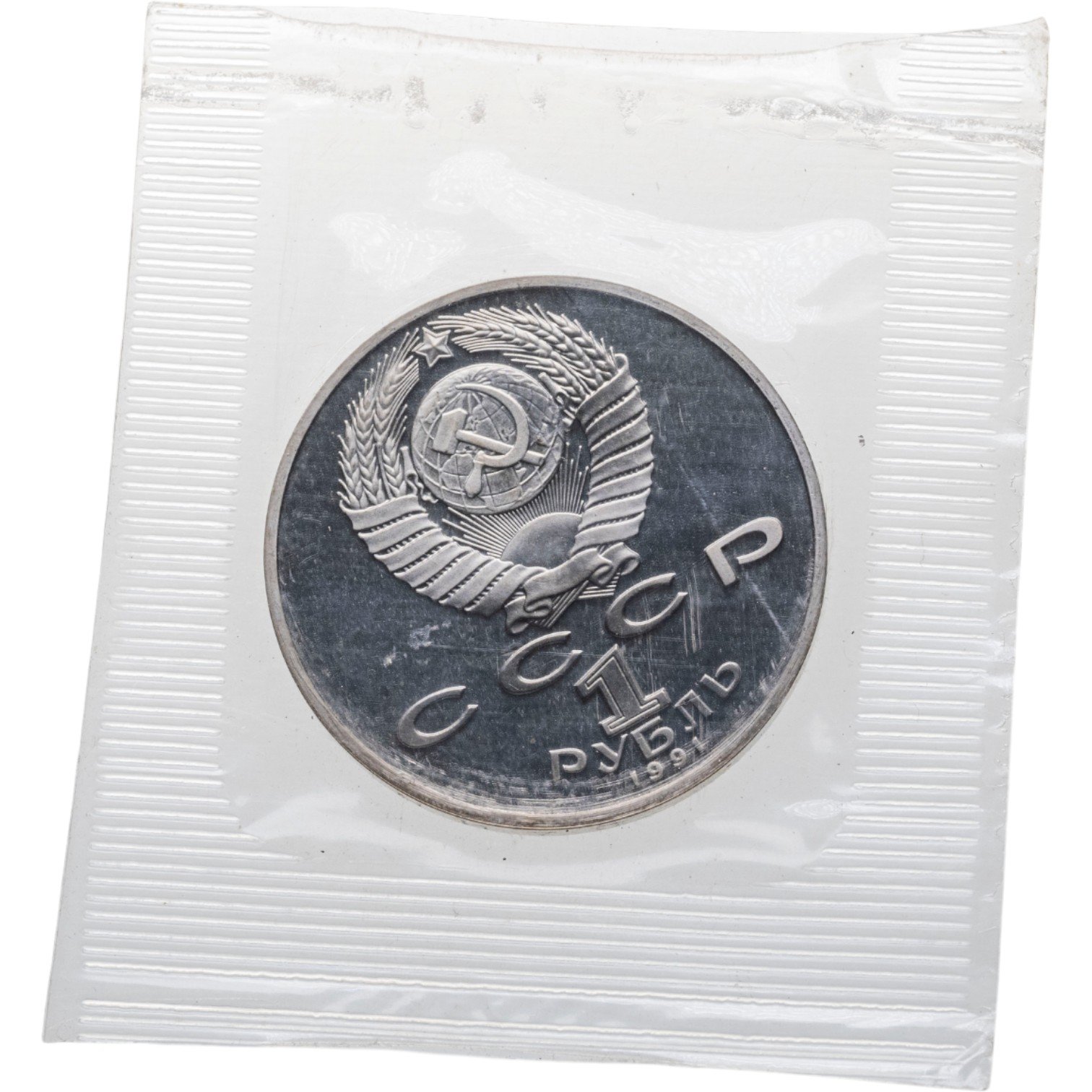 Сверху герб СССР с 15 витками ленты, под ним буквы «СССР», ниже обозначение достоинства монеты цифра «1» и ниже слово «РУБЛЬ», внизу у канта год выпуска монеты «1991».