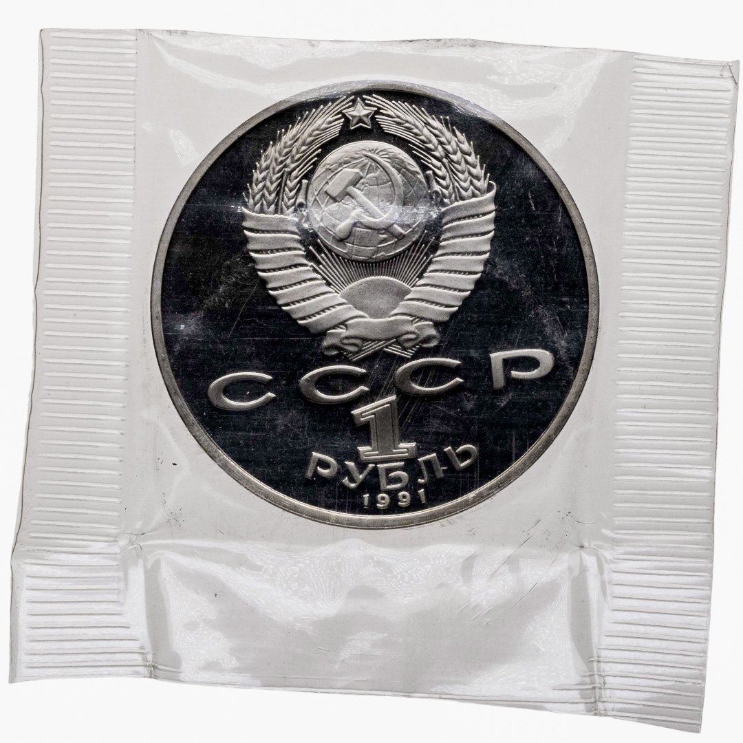 Сверху герб СССР с 15 витками ленты, под ним буквы «СССР», ниже обозначение достоинства монеты цифра «1» и ниже слово «РУБЛЬ», внизу у канта год выпуска монеты «1991».