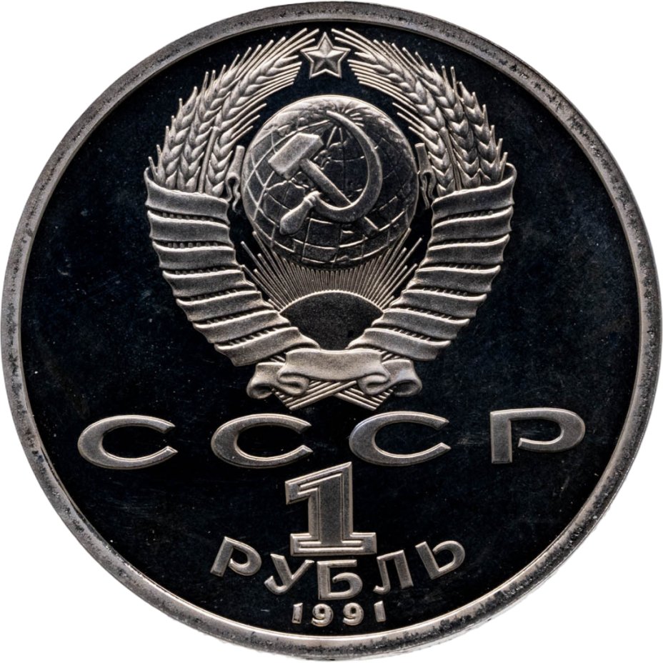 Сверху герб СССР с 15 витками ленты, под ним буквы «СССР», ниже обозначение достоинства монеты цифра «1» и ниже слово «РУБЛЬ», внизу у канта год выпуска монеты «1991».