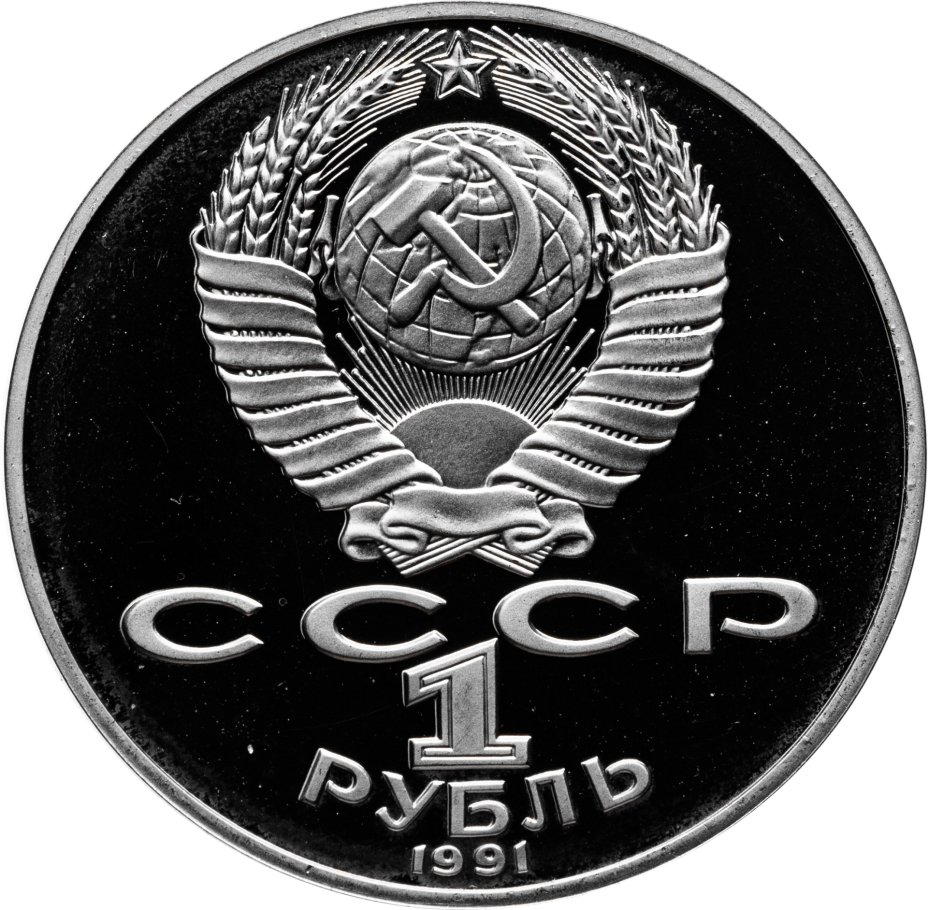 Сверху герб СССР с 15 витками ленты, под ним буквы «СССР», ниже обозначение достоинства монеты цифра «1» и ниже слово «РУБЛЬ», внизу у канта год выпуска монеты «1991».