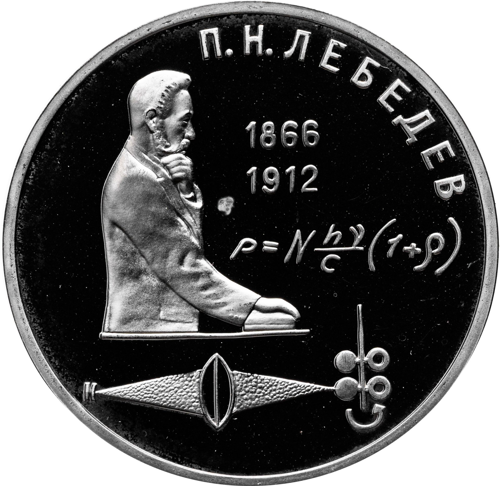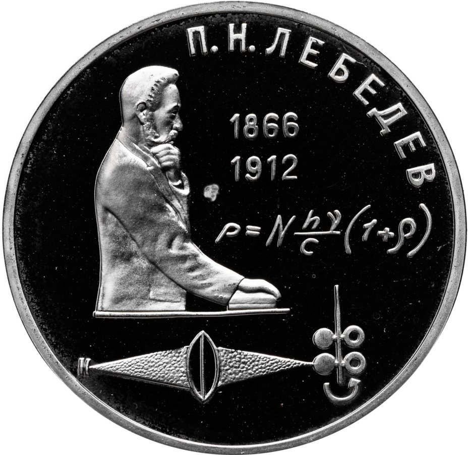 В левой части монеты боковое изображение П. Н. Лебедева. Справа от него в две строки даты «1866» и «1912», обозначающие годы жизни ученого. Под датами физическая формула давления света. В нижней части стилизованные изображения физических приборов. Сверху справа вдоль внешнего ободка монеты по окружности надпись: «П. Н. ЛЕБЕДЕВ».