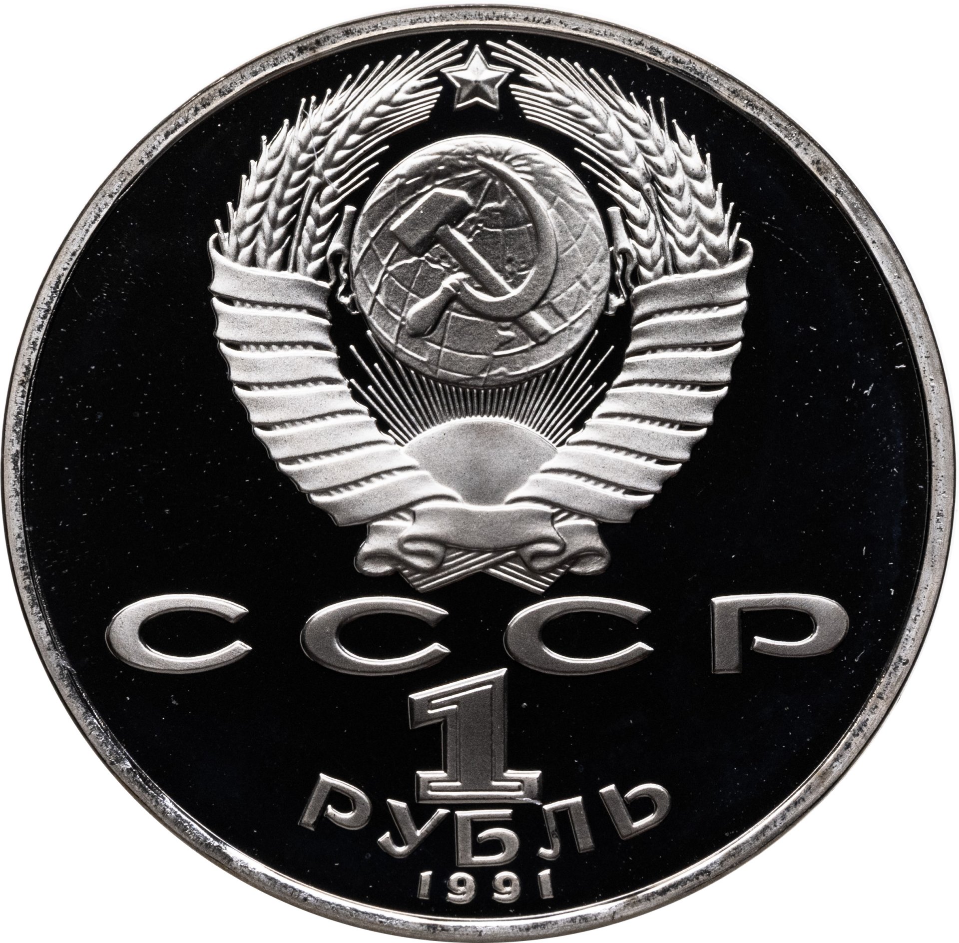 Сверху герб СССР с 15 витками ленты, под ним буквы «СССР», ниже обозначение достоинства монеты цифра «1» и ниже слово «РУБЛЬ», внизу у канта год выпуска монеты «1991».