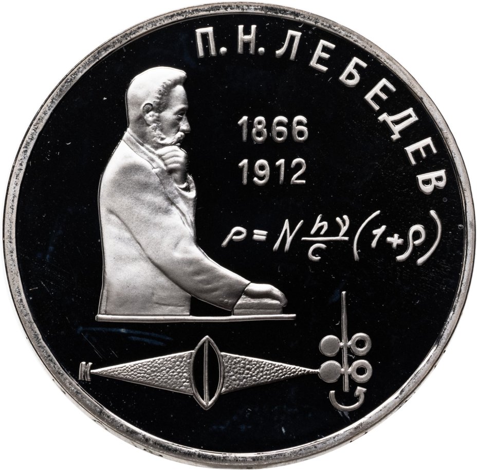В левой части монеты боковое изображение П. Н. Лебедева. Справа от него в две строки даты «1866» и «1912», обозначающие годы жизни ученого. Под датами физическая формула давления света. В нижней части стилизованные изображения физических приборов. Сверху справа вдоль внешнего ободка монеты по окружности надпись: «П. Н. ЛЕБЕДЕВ».