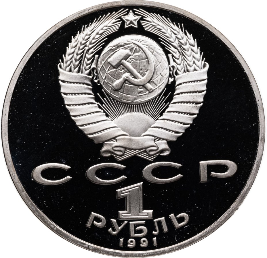 Сверху герб СССР с 15 витками ленты, под ним буквы «СССР», ниже обозначение достоинства монеты цифра «1» и ниже слово «РУБЛЬ», внизу у канта год выпуска монеты «1991».