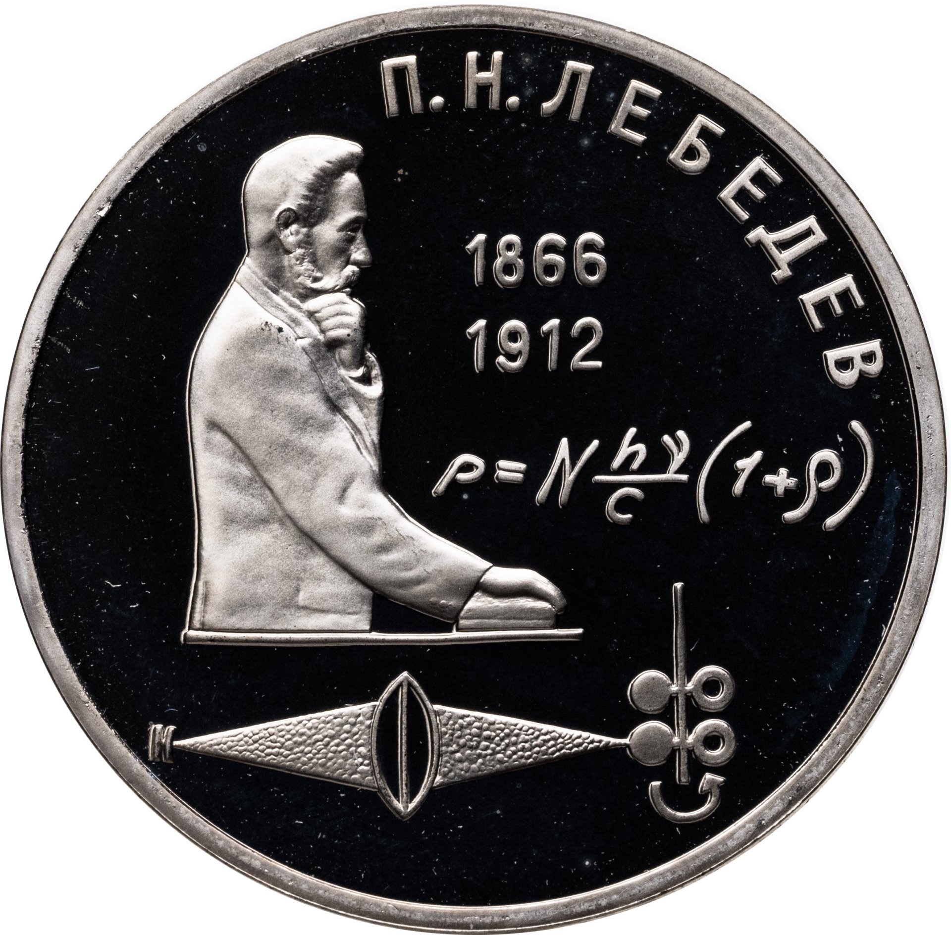 В левой части монеты боковое изображение П. Н. Лебедева. Справа от него в две строки даты «1866» и «1912», обозначающие годы жизни ученого. Под датами физическая формула давления света. В нижней части стилизованные изображения физических приборов. Сверху справа вдоль внешнего ободка монеты по окружности надпись: «П. Н. ЛЕБЕДЕВ».