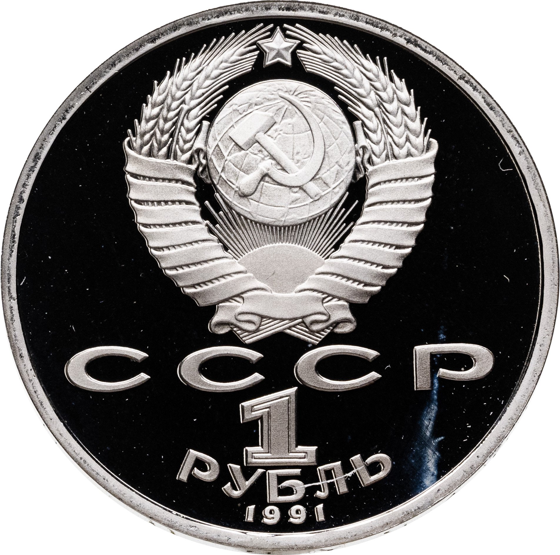 Сверху герб СССР с 15 витками ленты, под ним буквы «СССР», ниже обозначение достоинства монеты цифра «1» и ниже слово «РУБЛЬ», внизу у канта год выпуска монеты «1991».