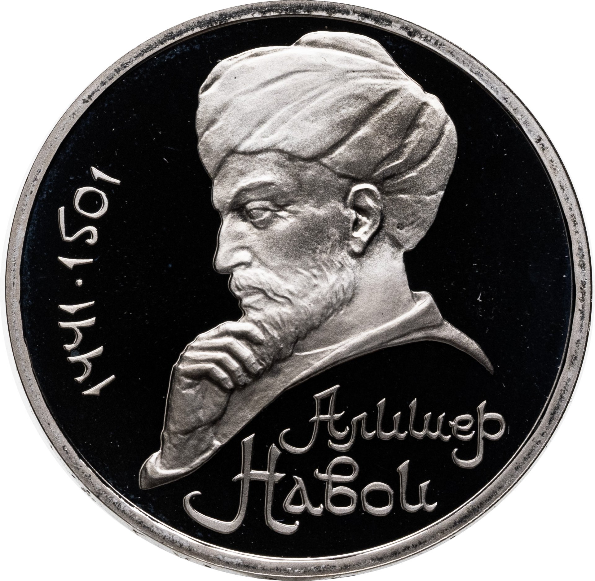 В центре портрет А. Навои. Слева от него вдоль внешнего ободка монеты полукругом приведены годы жизни поэта «1441» и «1501», разделенные точкой. Под портретом в две строки надпись «АЛИШЕР НАВОИ».