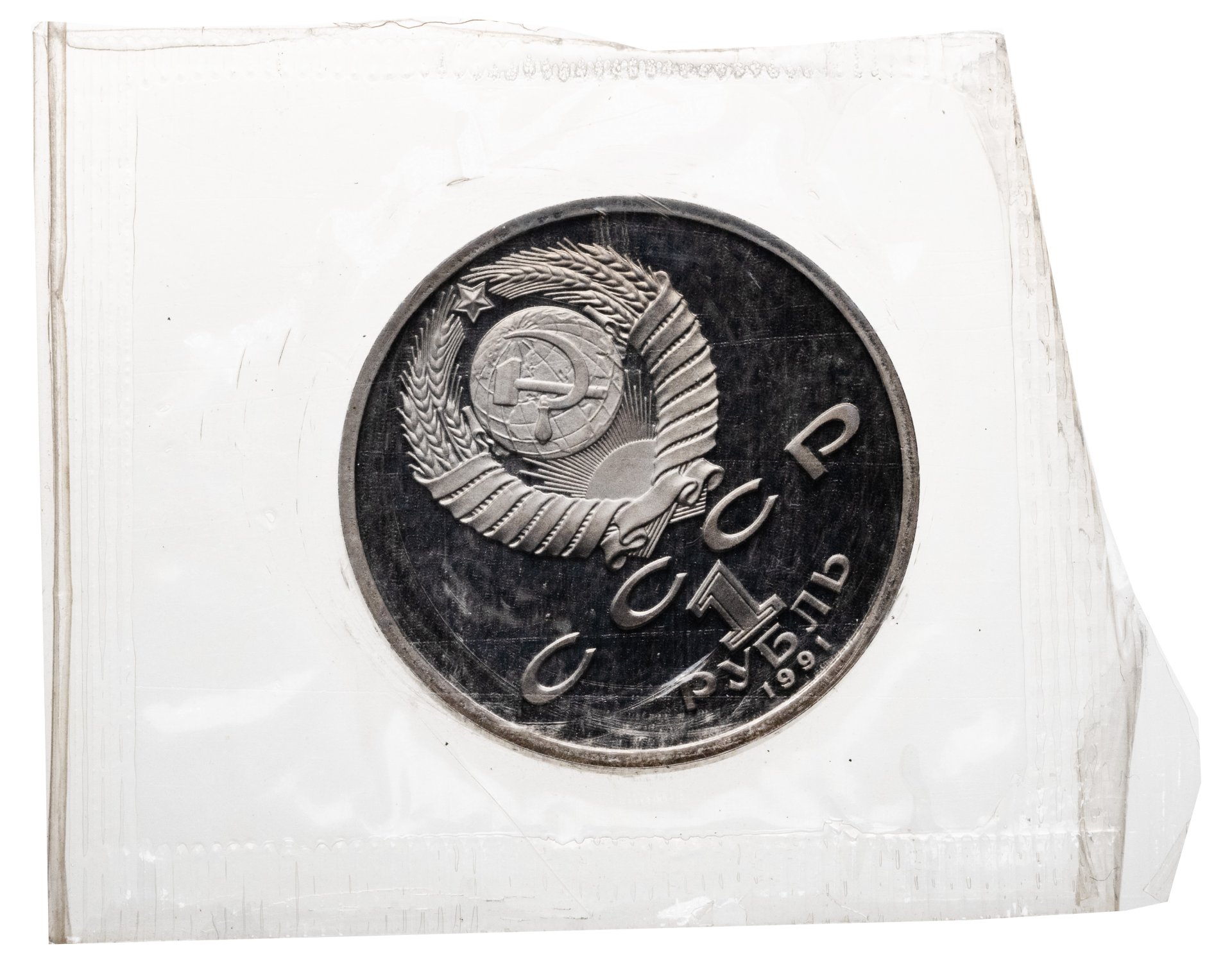 Сверху герб СССР с 15 витками ленты, под ним буквы «СССР», ниже обозначение достоинства монеты цифра «1» и ниже слово «РУБЛЬ», внизу у канта год выпуска монеты «1991».
