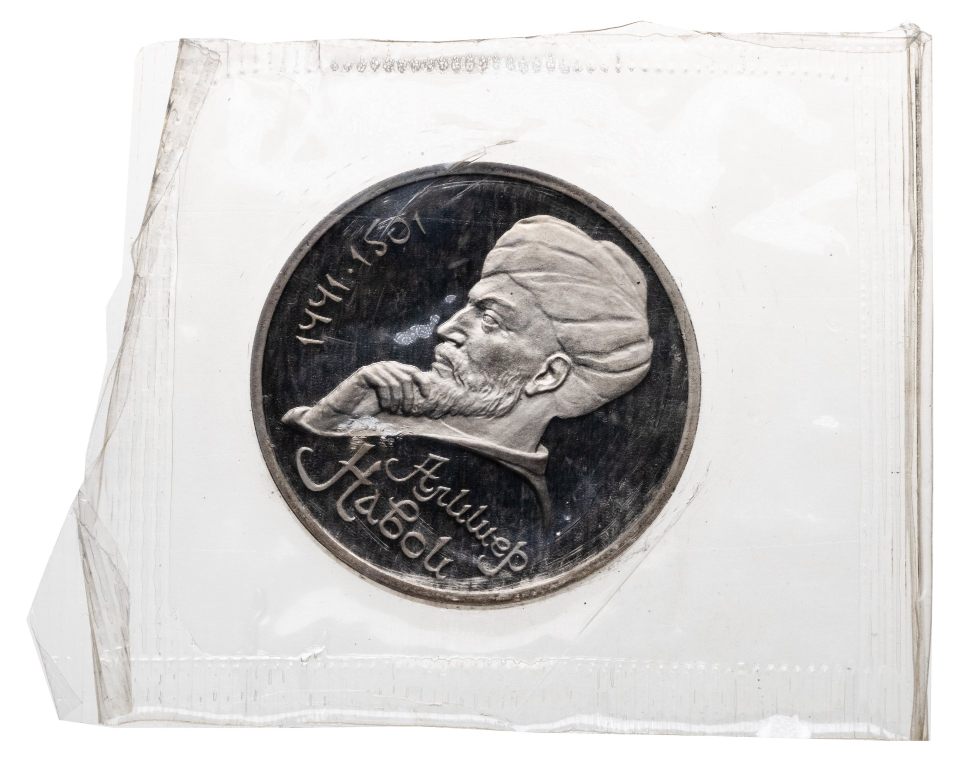 В центре портрет А. Навои. Слева от него вдоль внешнего ободка монеты полукругом приведены годы жизни поэта «1441» и «1501», разделенные точкой. Под портретом в две строки надпись «АЛИШЕР НАВОИ».