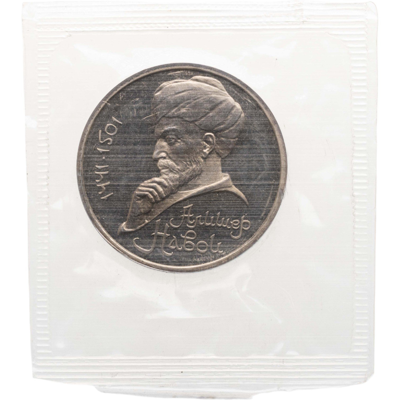 В центре портрет А. Навои. Слева от него вдоль внешнего ободка монеты полукругом приведены годы жизни поэта «1441» и «1501», разделенные точкой. Под портретом в две строки надпись «АЛИШЕР НАВОИ».