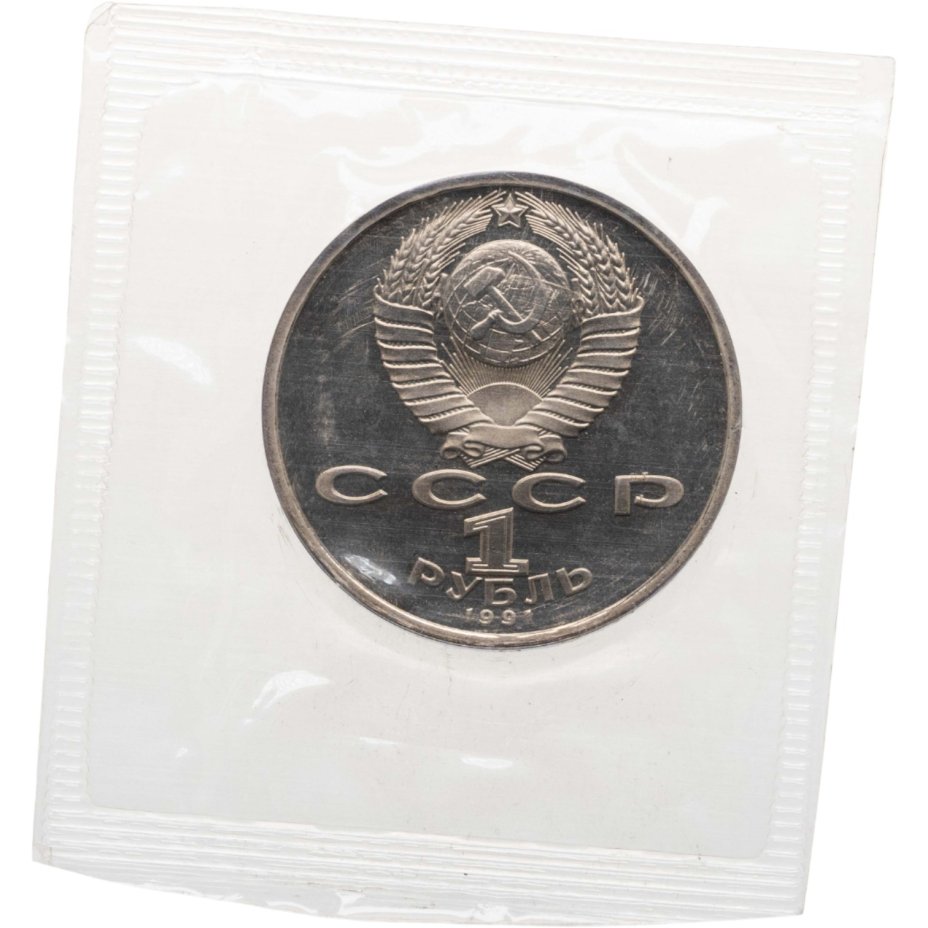 Сверху герб СССР с 15 витками ленты, под ним буквы «СССР», ниже обозначение достоинства монеты цифра «1» и ниже слово «РУБЛЬ», внизу у канта год выпуска монеты «1991».