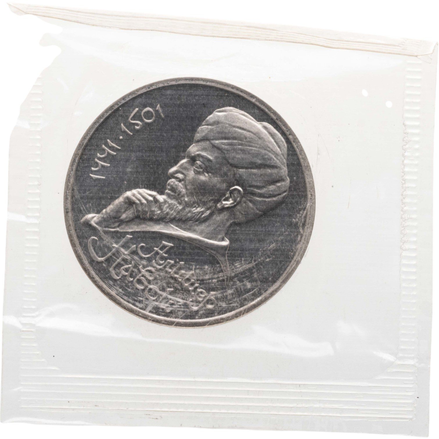 В центре портрет А. Навои. Слева от него вдоль внешнего ободка монеты полукругом приведены годы жизни поэта «1441» и «1501», разделенные точкой. Под портретом в две строки надпись «АЛИШЕР НАВОИ».
