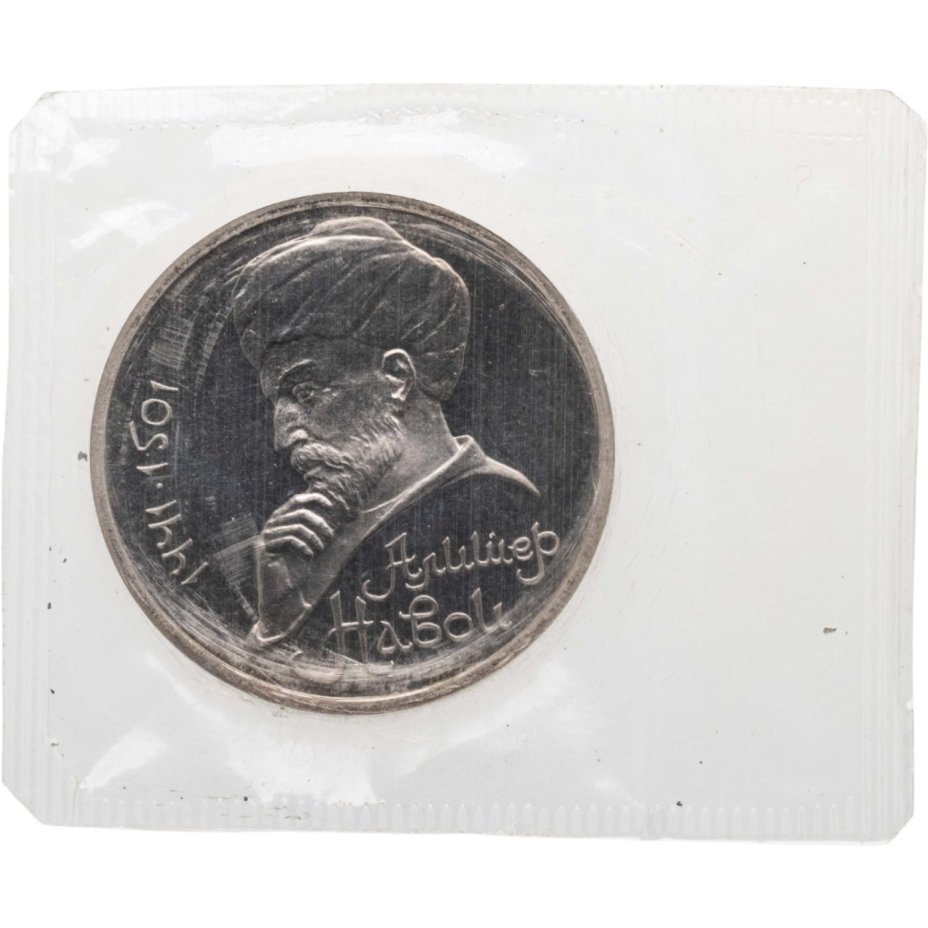 В центре портрет А. Навои. Слева от него вдоль внешнего ободка монеты полукругом приведены годы жизни поэта «1441» и «1501», разделенные точкой. Под портретом в две строки надпись «АЛИШЕР НАВОИ».